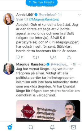 I dialog på Twitter med terrorforskaren Magnus Ranstorp menar Centerpartiets ordförande Annie Lööf att expertisen borde ha kunnat hålla de politiska partierna informerade om de värderingar som islamistiska organisationer och personer representerat för att Lööf skulle ha kunnat agera annorlunda. Lööf skjuter över skulden på Ranstorp och expertisen.